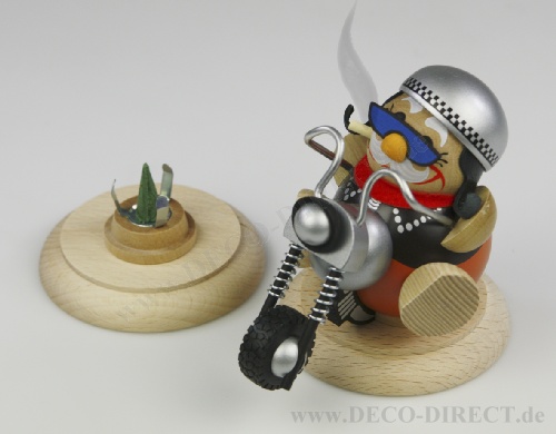 DECO DIRECT® Kugelmännchen Smokey Motorradfahrer auf Sockel aus Buche-Massivholz, H: ca. 13,0 cm, inkl. 1 Packung Räucherkegel Duft Grüner Apfel, Gravur-Empfehlung: Rundgravur auf Holzsockel, Bestellnummer: 77221410